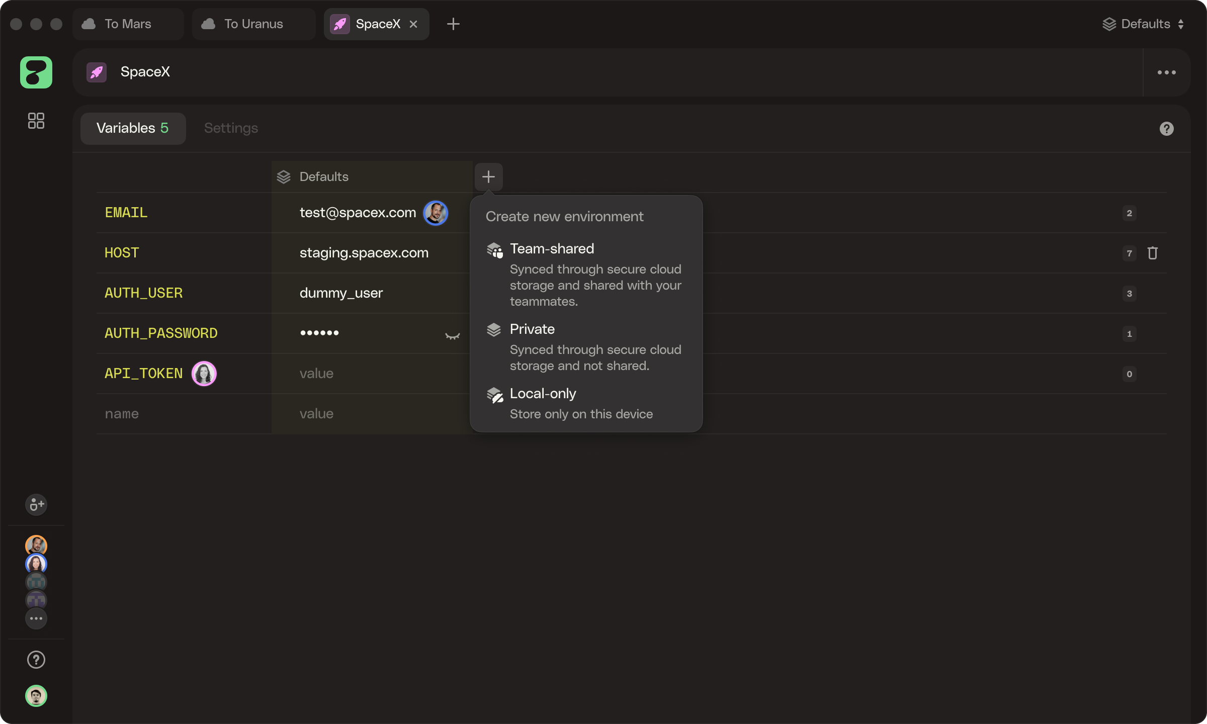 Store your credentials in shared environments. All your team’s data is securely synced with the HTTPie cloud.